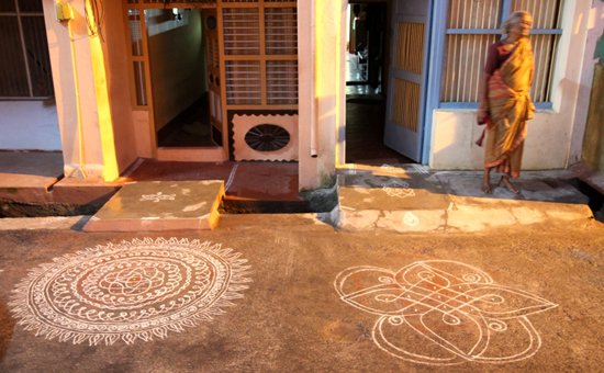 streaks of the ‘kolam’ or ‘rangoli’ drawn outside innumerable homes in many