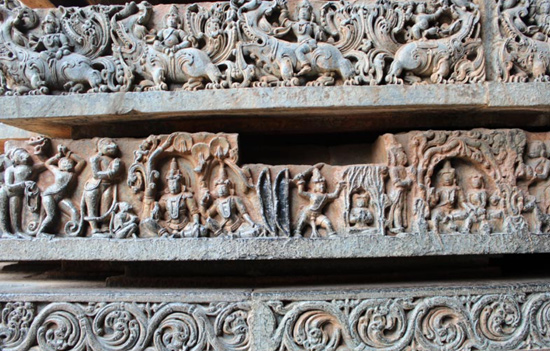 Left of pic are monkeys, Hanuman, Ram and Laxman. Right of pic are Sri Ram and Sita in a hut. Halebidu Temple Karnataka.